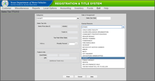 - Counties processing transactions in the Registration and Title System will need to select “Other” as the Exempt Reason on the Sales Tax TTL012 screen.