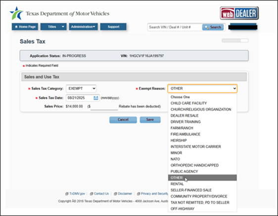 - Dealers processing transactions in webDEALER will need to select “Other” as the Exempt Reason on the Sales Tax screen.